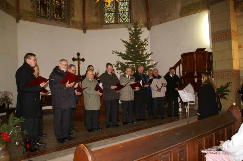 Im Anschluss daran sang der Männerchor „Eintracht“. Seine Dirigentin Vera Hof hatte zwei ihrer musikalisch begabten Kinder mitgebracht, die zwei Lieder auf der Flöte und der Oboe begleiteten. Das abschließende Lied „Still senkt sich die Nacht hernieder“ gehörte dank der Solodarbietung von Vera Hof mit ihrer zauberhaften Stimme fraglos zu den Höhepunkten des Konzerts.