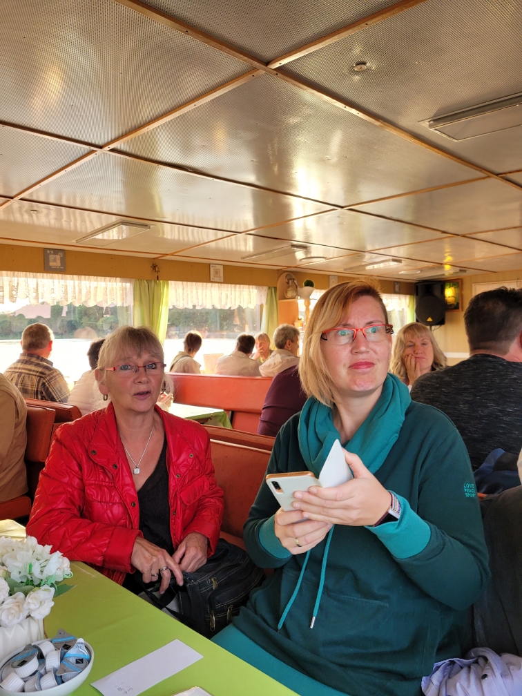 Nach der Kaffeetafel ging es mit der Krumbholz-Parkbahn Richtung Tiergarten, von wo wir nach ein paar Schritten zum Schiffsanleger an der Saale kamen. Hier lag die „Saalefee“ vor Anker, auf der die Organisatoren eine Mondscheinfahrt für uns gebucht hatten.