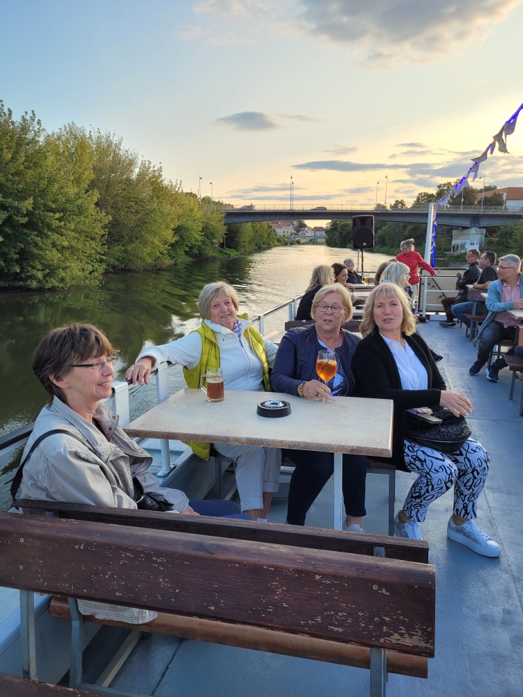 Während der Fahrt wurde uns ein schmackhaftes Abendessen serviert, natürlich begleitet von diversen geistigen und erfrischenden Getränken. Ein DJ unterhielt den „Kahn der fröhlichen Leute“ mit Tanzmusik bis nach der Ankunft an der Anlegestelle.