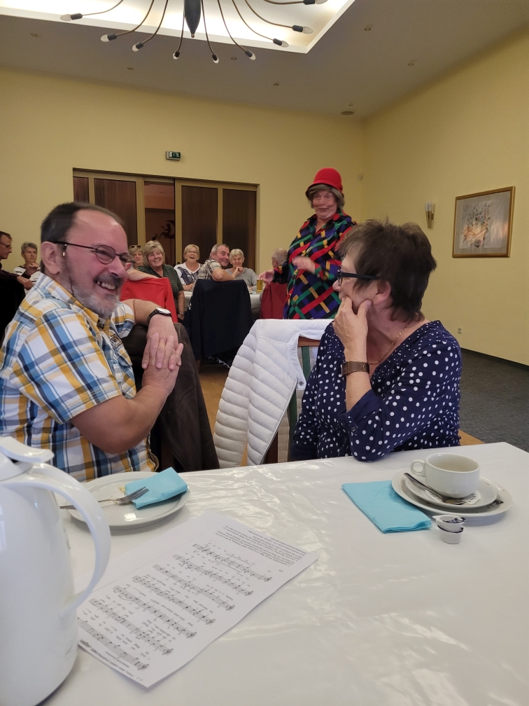 Zuerst ging es mit dem Bus ins „Paradies“ nach Bernburg, wo uns schon eine gedeckte Kaffeetafel erwartete. Vorher unterhielt der Chor aber noch die mitgereisten Gäste mit einigen Liedern unter der Leitung unserer Dirigentin Vera Hof.