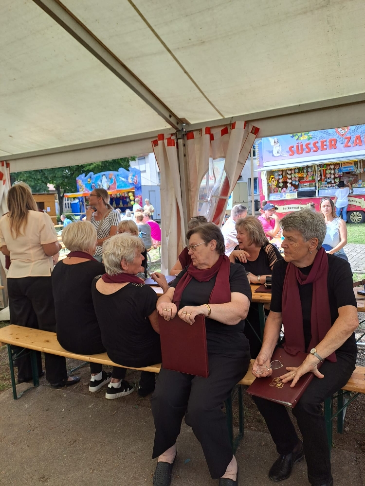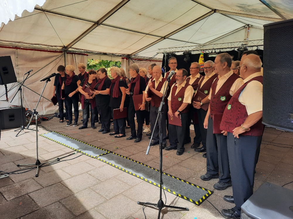 Die von Vera Hof souverän dirigierten Darbietungen kamen beim Publikum gut an, das nicht mit Applaus sparte. Allerdings muss kritisch angemerkt werden, dass im Festzelt ein hoher Lärmpegel vorherrschte, da offenbar einige Gäste nicht gekommen waren, um den neuen gemischten Chor zu hören, sondern um sich lautstark zu begrüßen und sich über die neuesten Familienerlebnisse auszutauschen. Aber wir ließen uns davon nicht aus dem Konzept bringen, sondern sangen unsere Lieder diszipliniert und engagiert.
