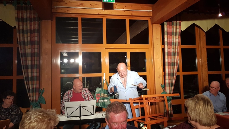 Danach ging es weiter nach Mandelholz, zwischen Elend und Königshütte gelegen. Im dortigen Restaurant „Grüne Tanne“ war für uns ein üppiges Abendessen mit Kabarettprogramm bestellt. Leider waren wir nicht die einzigen Besucher im Saal, so dass bestimmte chorinterne Stimmungseinlagen wegfallen mussten. Aber zumindest konnten wir zu Beginn einige unserer Lieder singen, die offensichtlich auch bei den anderen Gästen gut ankamen.