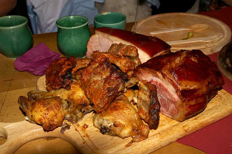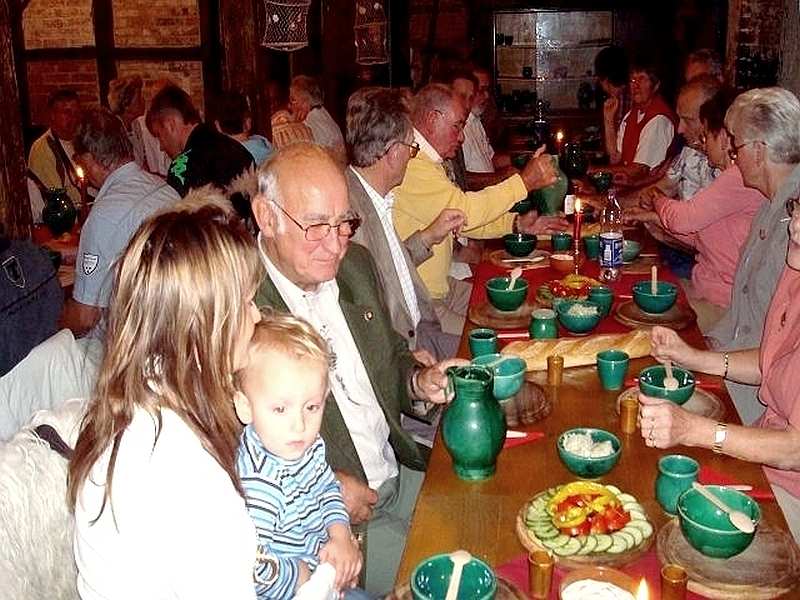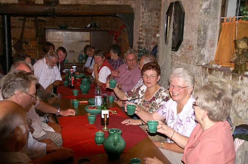 Nach einer gemütlichen Kaffeetafel und einem ausgiebigen Rundgang über den Hexentanzplatz fuhr der Bus uns weiter nach Halberstadt. Dort hatten die rührigen Organisatoren in dem mittelalterlich gestalteten Gasthaus „Zur Pfeife“ einen Ritterschmaus vorbereiten lassen. Ohne Messer und Gabel wurde von Holztellern und aus Steinkrügen Deftiges aus Topf und Pfanne verzehrt und Süffiges aus Fass und Flasche genossen.