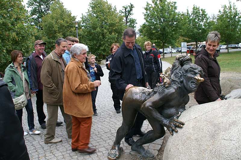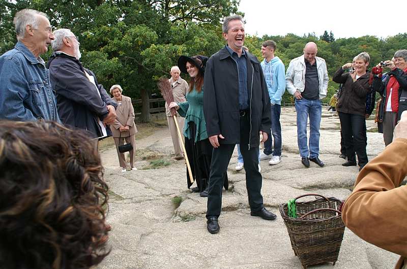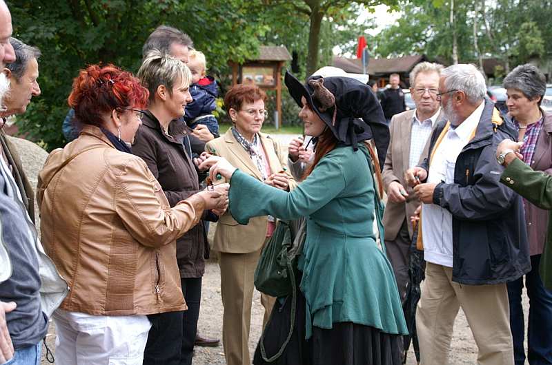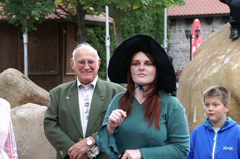 Das bis zum letzten Moment geheim gehaltene Ziel der Busfahrt bestand aus zwei Stationen: Zuerst ging es nach Thale, wo wir mit der neuen Seilbahn auf den Hexentanzplatz fuhren. Oben angekommen, wurden wir von einer zünftigen Brockenhexe empfangen, die uns Wissenswertes über die Walpurgisnacht und andere Hexengeschichten erzählte. Mehrere unserer Sänger assistierten ihr bei ihren verschiedenen „Zauberkunststücken“, so beim Brauen des Hexentrunks und bei lustigen Spielen mit dem Hexenbesen. Auch unsere „choreigene“ Hexe Michaela hatte sich eine Besenübung ausgedacht, bei der die Männer ihre körperliche Fitness beweisen konnten.