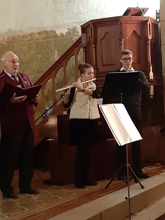 Der Männerchor „Eintracht“ bestritt den zweiten Teil des Konzerts. Hier ist hervorzuheben, dass die Dirigentin Vera Hof drei ihrer Kinder mitgebracht hatte, die den Chor teils gesanglich und teils instrumental unterstützten. Der Höhepunkt war sicherlich das Solo von Vera Hof „Adeste fideles“, bei dem sie von ihren Söhnen Jakob am Klavier und Josef mit der Oboe begleitet wurde.